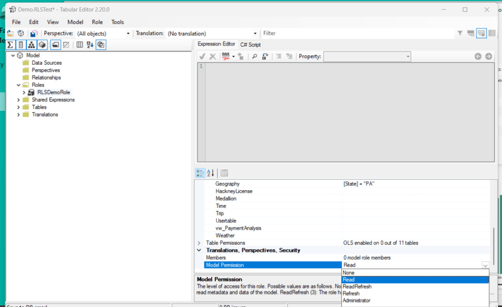 And finally, we can set up our RLS roles. Right click the Roles folder, and create a new role. Scroll down to Row Level Security, and apply your RLS rule of choice. In this case, I am implementing a simple DAX filter on my Geography dimension: