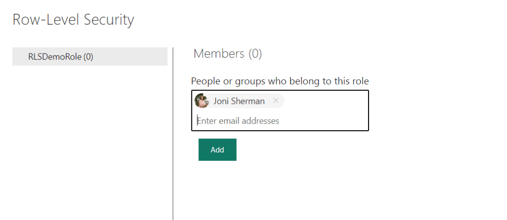Now you can finally save and publish your model changes to the service. The next step is to open the Security Settings of your semantic model, and add members to your newly created roles: