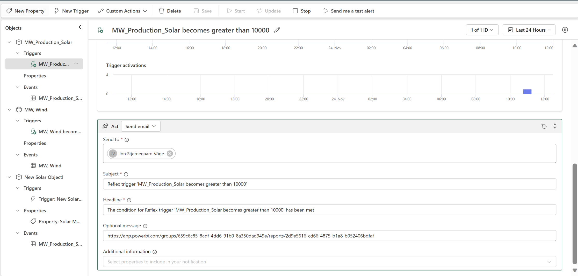 If I go back to Power BI and create another Alert from my report, and store it in the same reflex, another Object containing a new Event and Trigger will show up: