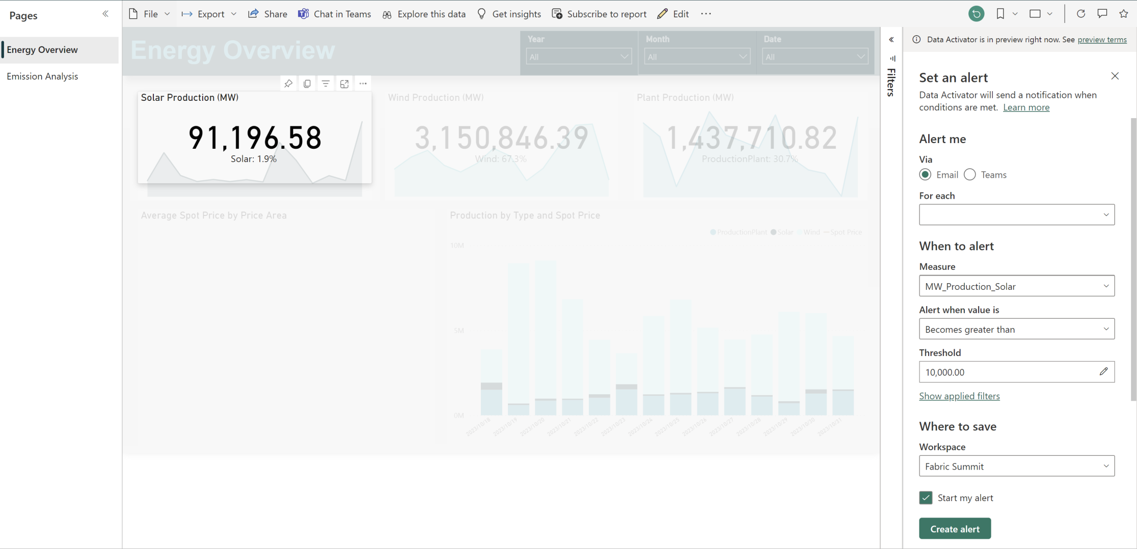 Creating alert will save a ‘Reflex’, the artifact belonging to Data Activator, in a Workspace of your choice, including storing the data object for future use in other triggers too. If you check the “Start my alert” box, you actually have a fully functioning data driven alert just like that!