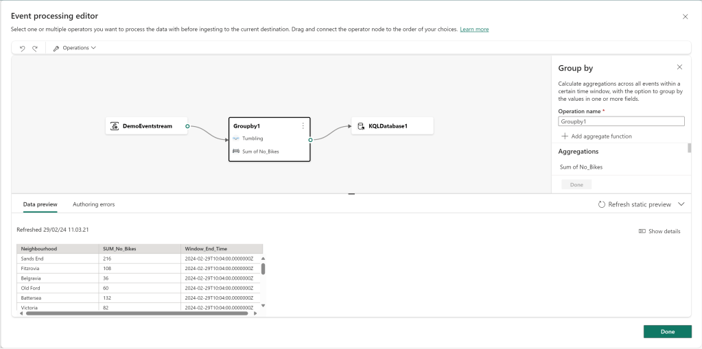 In addition to the flow above, I also created a more simple Aggregated Output to another table in the KQL Database, in which I used the Group By operation to create an aggregated table as seen below: