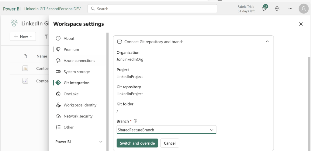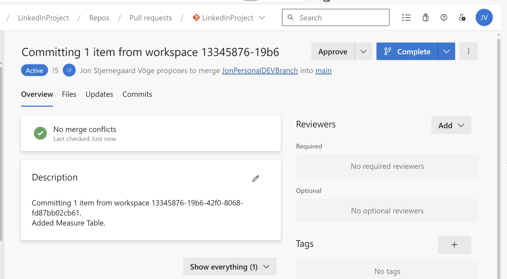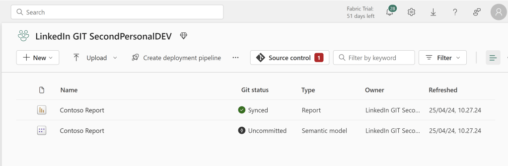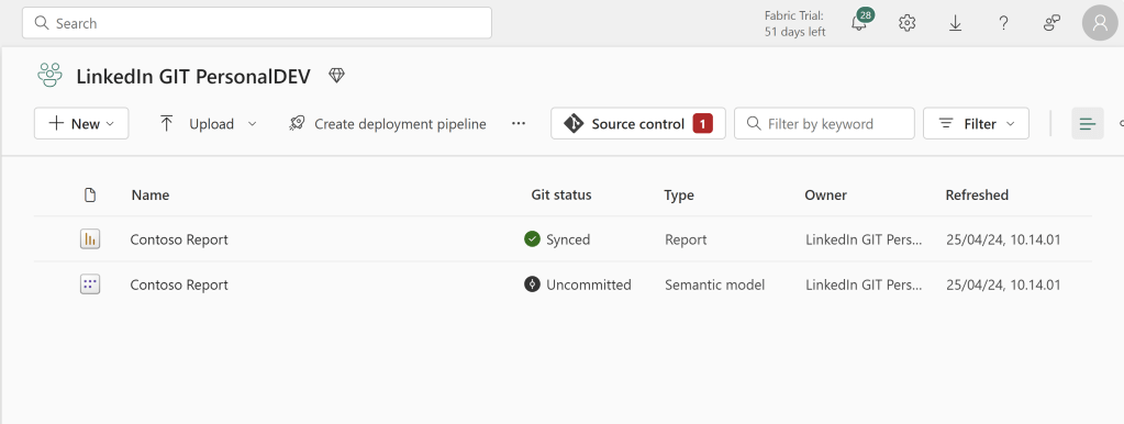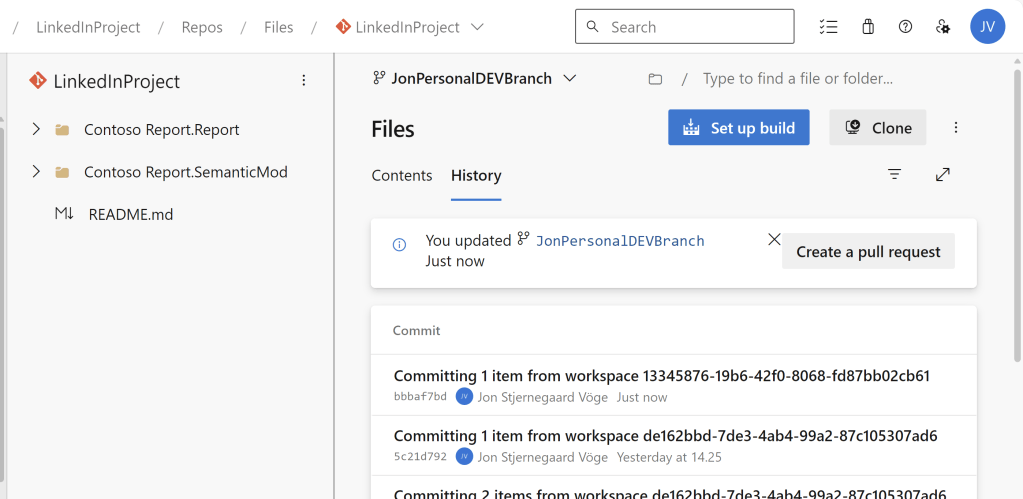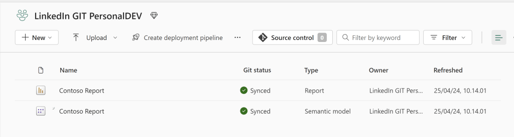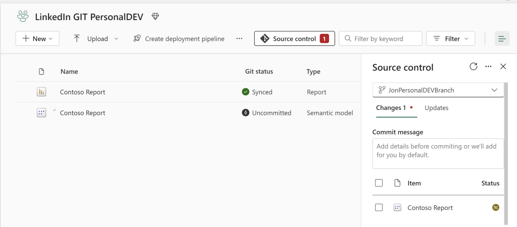 To get started, follow my previous blog, to create an Azure DevOps repos, a development Workspace and setup the two to be synchronized: https://downhill-data.com/2024/06/18/simple-version-history-in-fabric-power-bi-with-git-integration-a-beginners-guide/