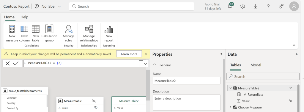 Let’s try to make a change to the Semantic Model. Here I am creating a new table to be used as Measure Table. I have moved one of my Calculated Measures into the table, and hidden the original column: