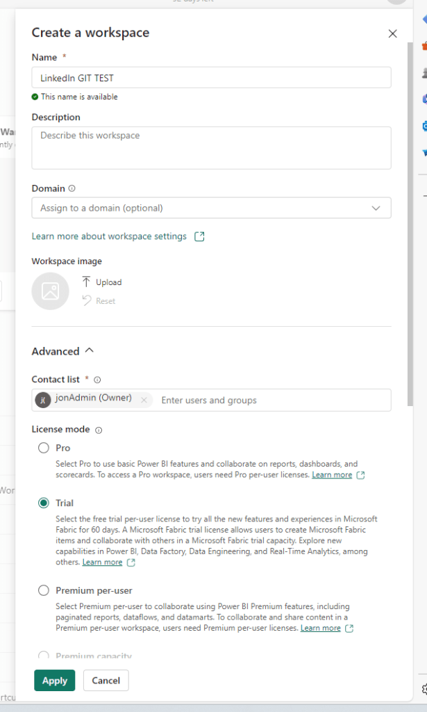 Next, we will create and setup our Deployment Pipeline as well as TEST and PROD workspaces. Start by creating two new workspaces for TEST and PROD: