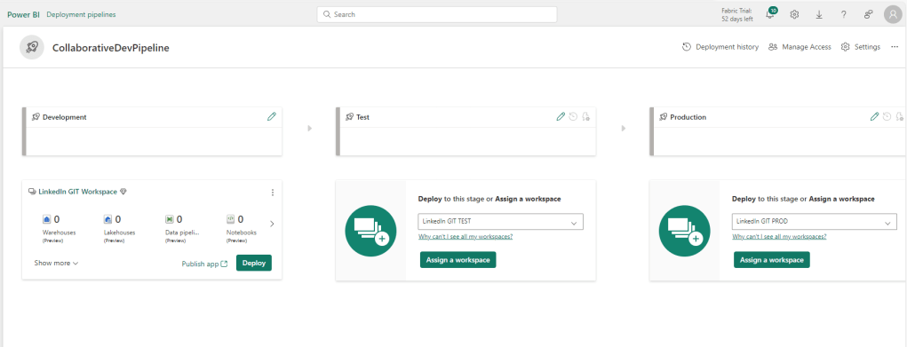Then create a new Deployment Pipeline, and point each stage of the Pipeline to each of your three workspaces.
