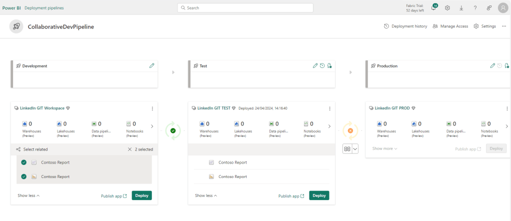 You will simply create two TEST & PROD Environments, as well as two Deployment Pipelines: One for your models, and one for your reports.