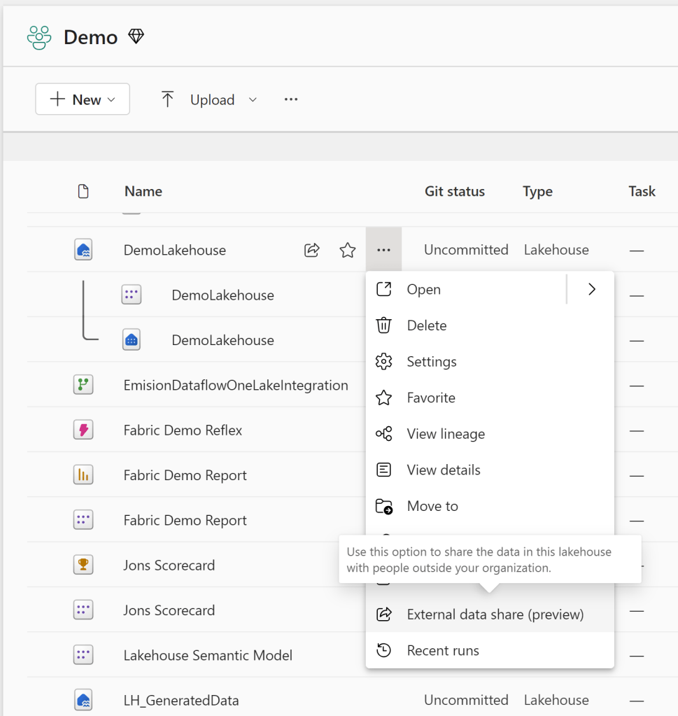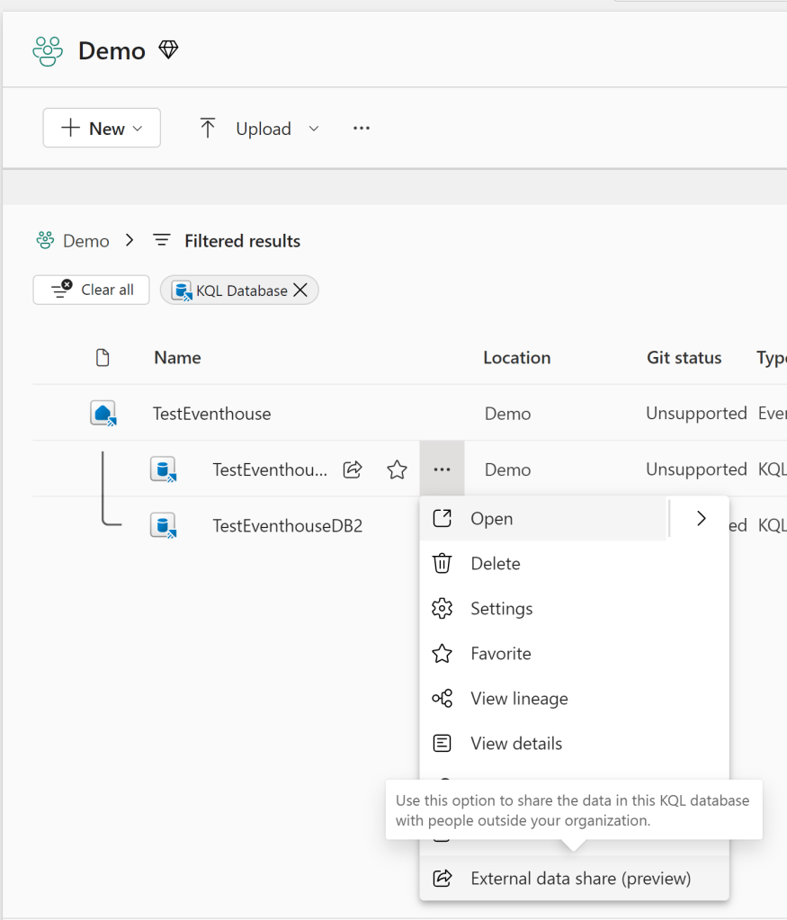In order to share either a Lakehouse or KQL Database, navigate to the item in your Workspace, and find the External Data Share option: