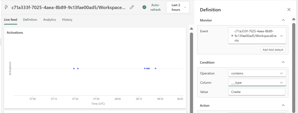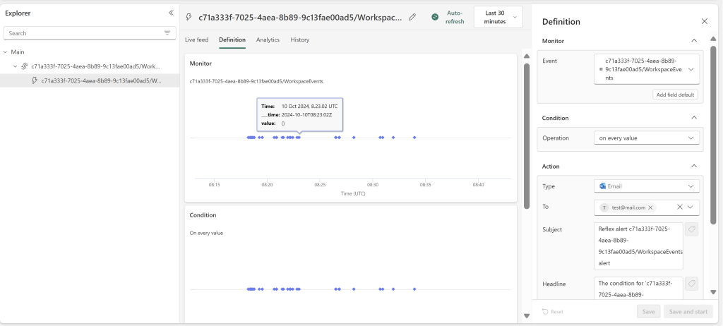 Clicking Save will connect your Reflex to the Fabric Workspace Item Event data for the selected workspace, and you’ll find yourself in front of the updated Data Activator interface: