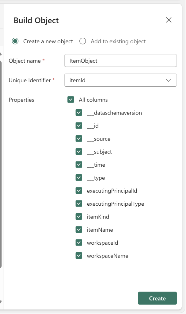 Another fly out menu allows us to specify the Identifier needed to group the objects, and we can select which Properties to include: