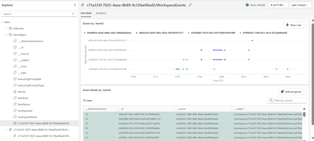 If you select “Fabric Workspace Item Events”, you’ll be able to select which workspace to monitor, and explore the schema of the different event types further: