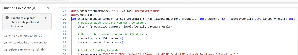 In the same User Data Function used in the previous blog, I then go ahead and alter the function definition: