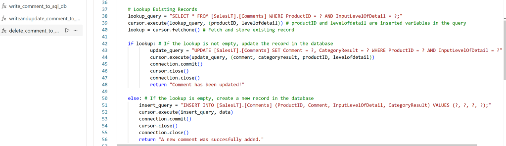 lookup_query = "SELECT * FROM [SalesLT].[Comments] WHERE ProductID = ? AND InputLevelOfDetail = ?;"