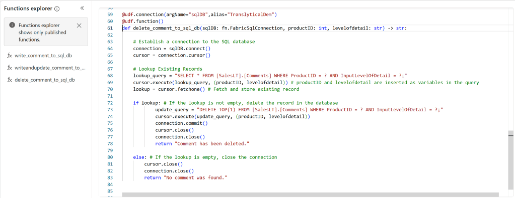 For instructions on setting up the User Data Function to add the comment, refer back to last weeks blog post: https://downhill-data.com/2025/06/03/guide-native-power-bi-write-back-in-fabric-with-translytical-task-flows-how-to-build-a-comment-annotation-solution-for-power-bi/