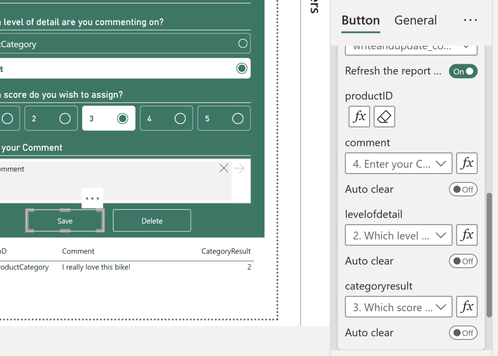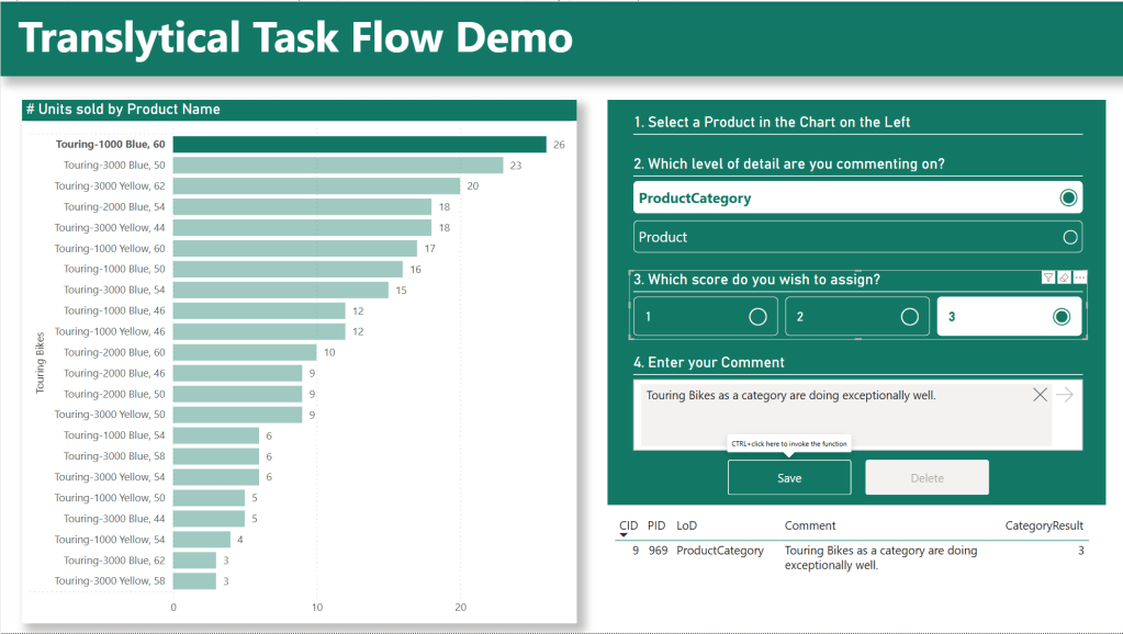 And we now finally have a Translytical Task Flow allowing the user to input three separate parameters via List Slicer, Button Slicer and Text Slicer, to log annotations and scores on two separate levels of detail at the same time: