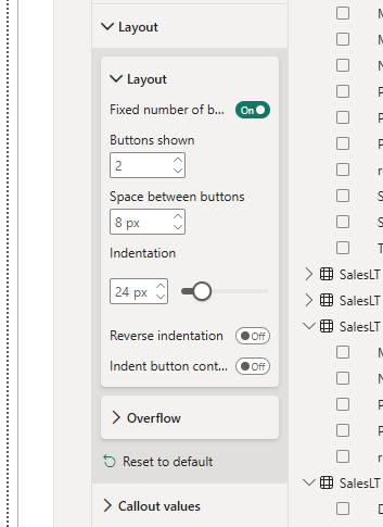 Now I can add a List Slicer to my report, add the LevelOfDetail field from my newly added table to the field well of the slicer, and apply some formatting including the layout definition seen below, to achieve a nice native-looking list like the following: