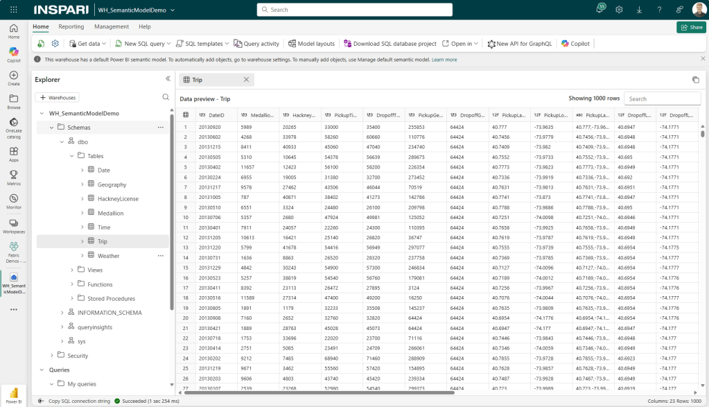 In this example, I have a Fabric Warehouse with the frequently used New York Taxi Sample dataset. I could have used the Lakehouse SQL Endpoint or a SQL DB in Fabric, but in this case I chose a Warehouse: