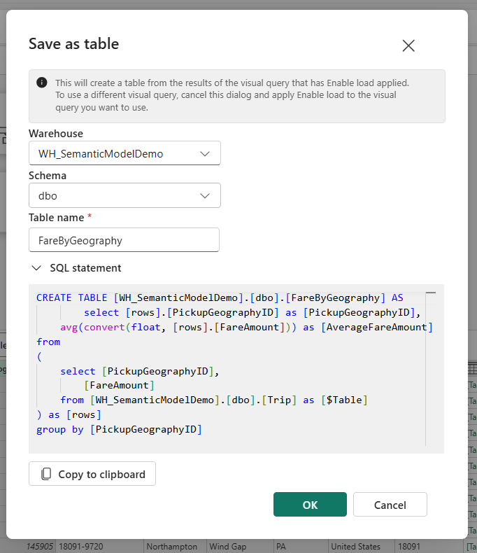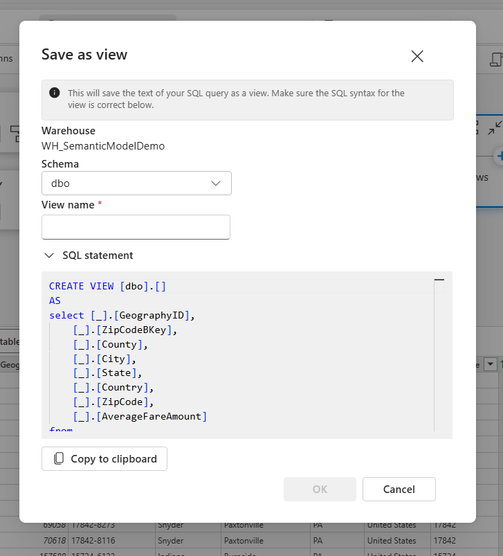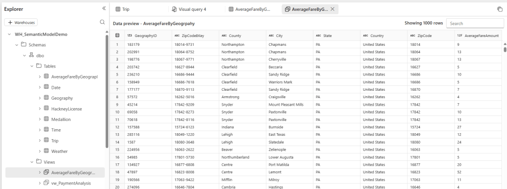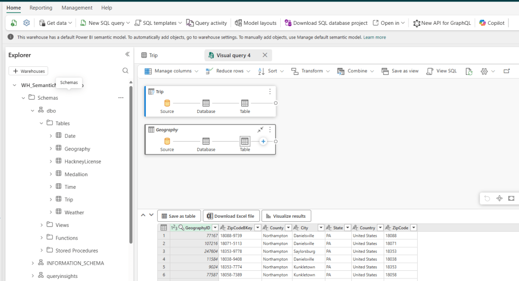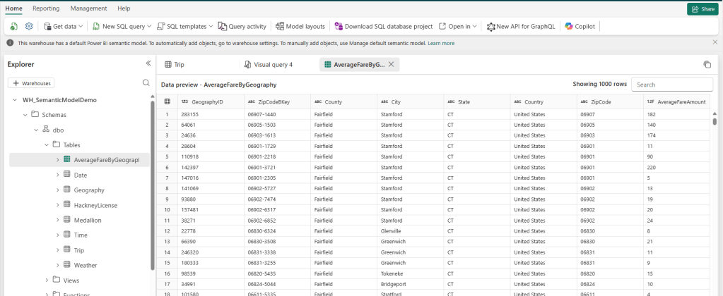 I can now query my table and view from within my Warehouse, and use those repeatedly within my Semantic Models or other data solutions in Fabric. And all I did was use a little bit of low-code magic in the visual query builder: